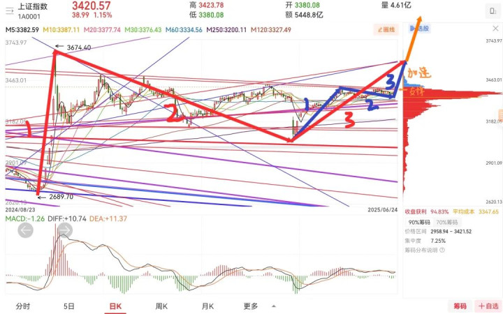 从理论层面来讲,3浪作为主升浪,其上涨空间与上涨速度通常会显著大于1浪。仅以3600点作为目标位,远无法匹配3浪主升浪的应有表现。因此,当市场运行至3600点附近时,我可能会综合多方面因素,考虑是否存在高抛低吸的操作机会。而在此之前,将坚定看涨,保持重仓。